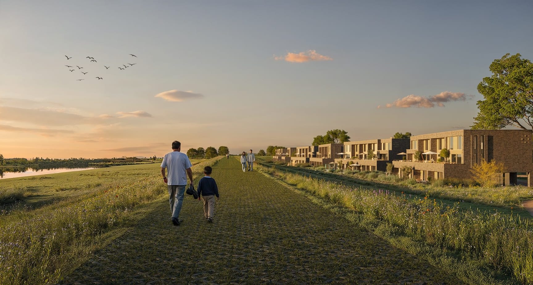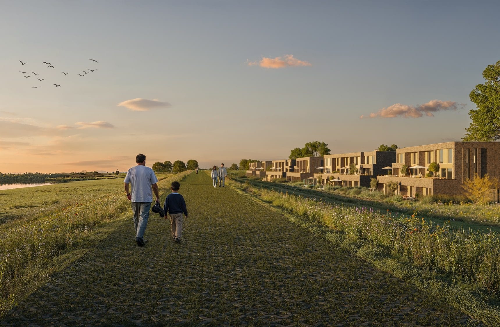 De woningen staan iets hoger, waardoor je vanuit de woonkamer over het water kijkt. Beneden ligt de tuin, boven een terras of balkon op het zuiden of westen. Ruimte, licht en uitzicht staan centraal. Hier woon je letterlijk op de grens van stad en natuur.