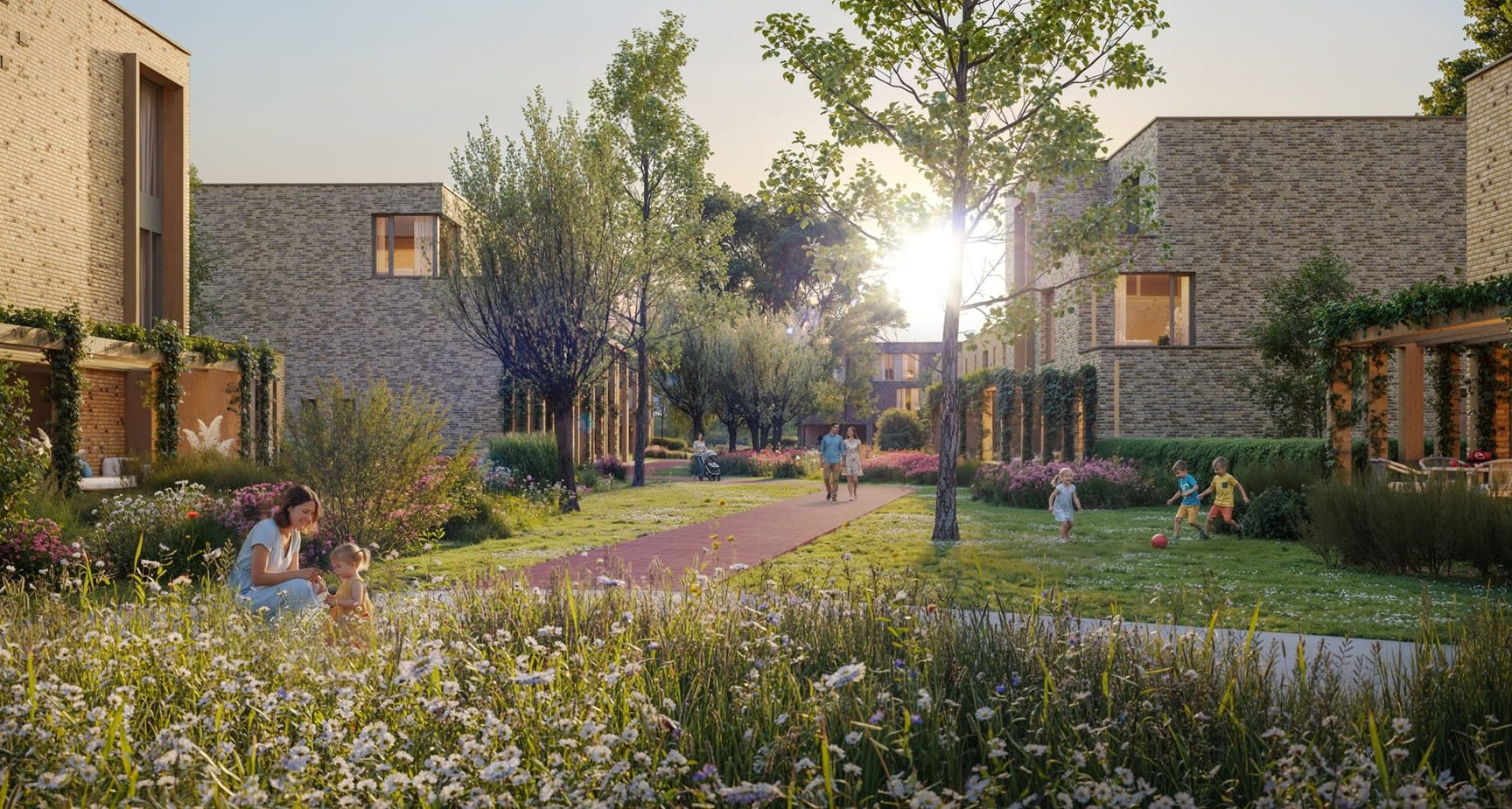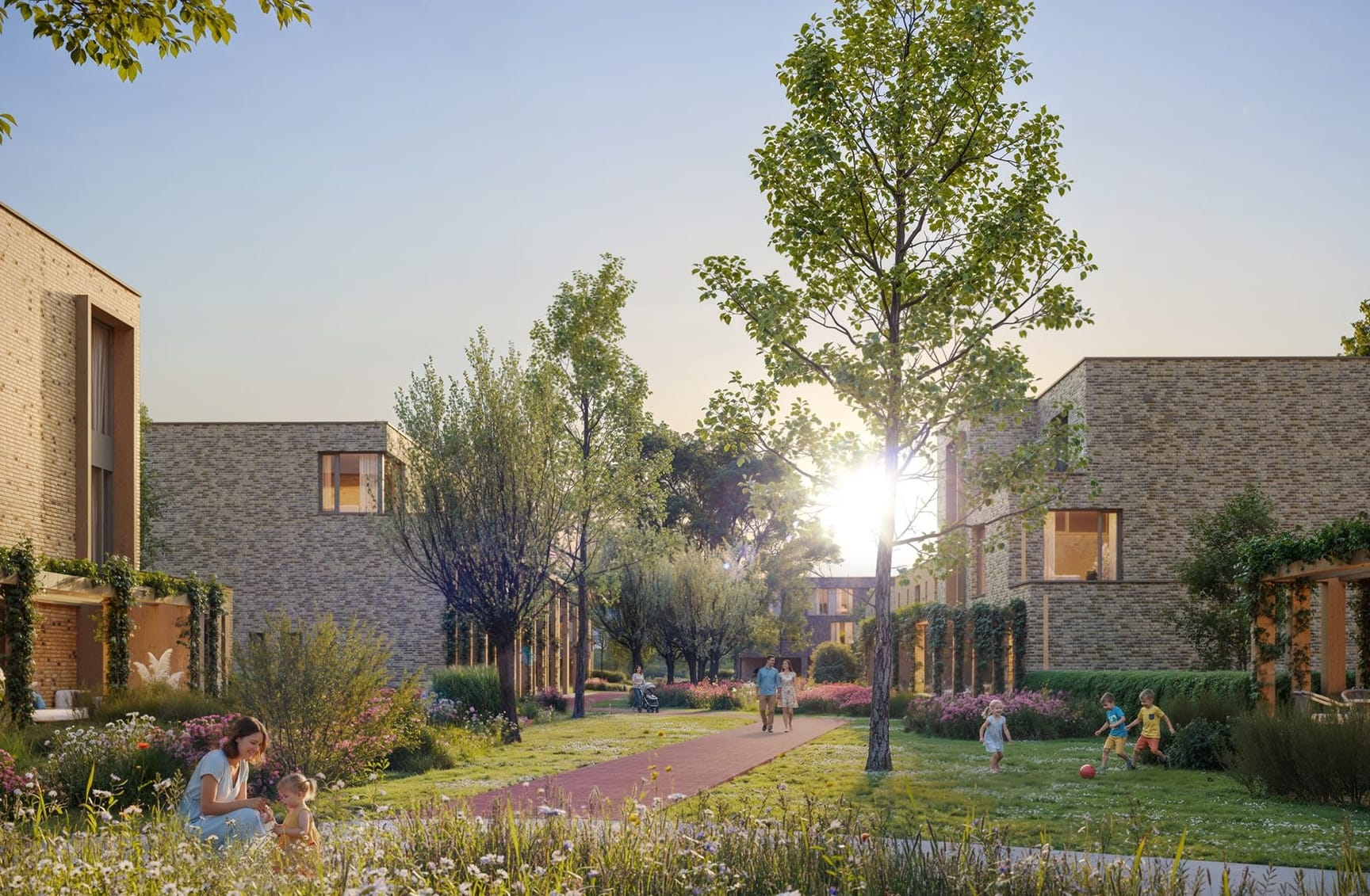 De hofwoningen liggen aan autoluwe hoven die zijn ingericht met veel groen en ruimte om elkaar te ontmoeten. De opzet is open, maar tegelijkertijd beschut: kinderen kunnen veilig spelen, buren maken makkelijk contact en er is altijd een plek in de zon of schaduw te vinden.