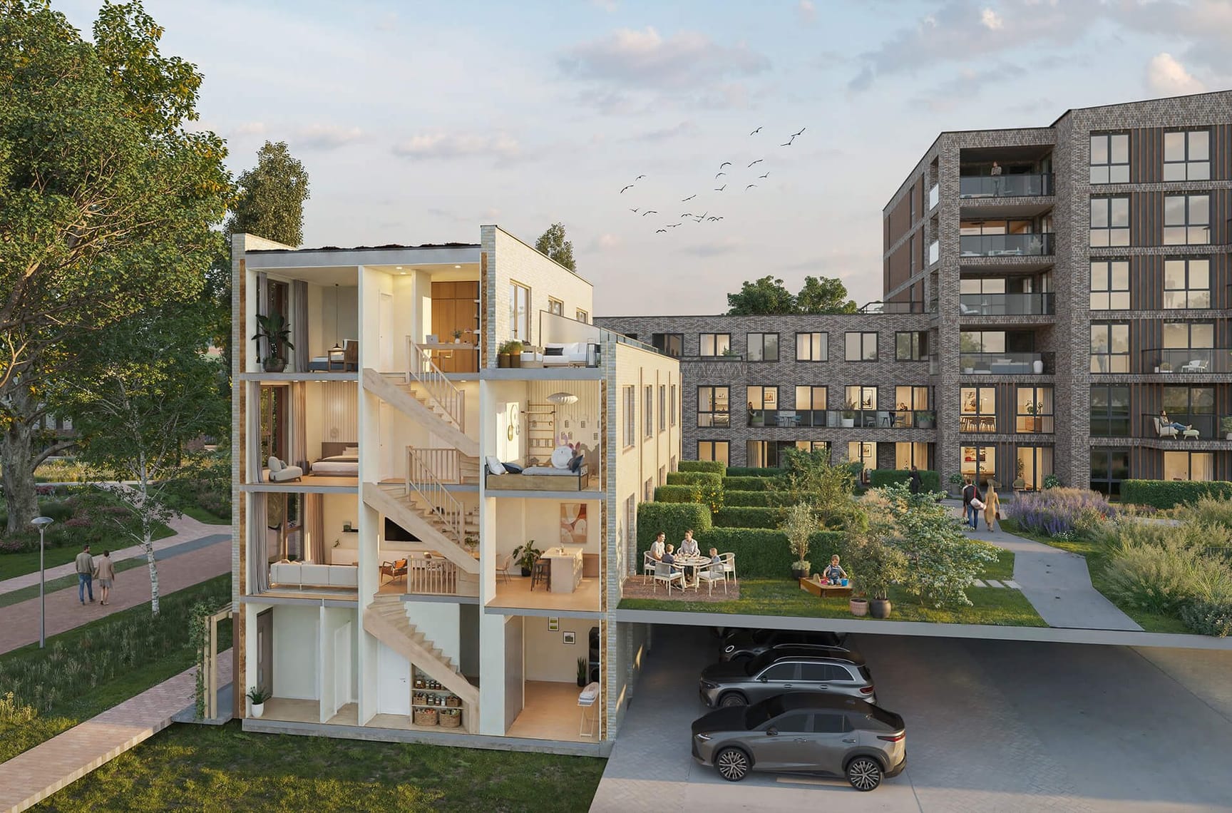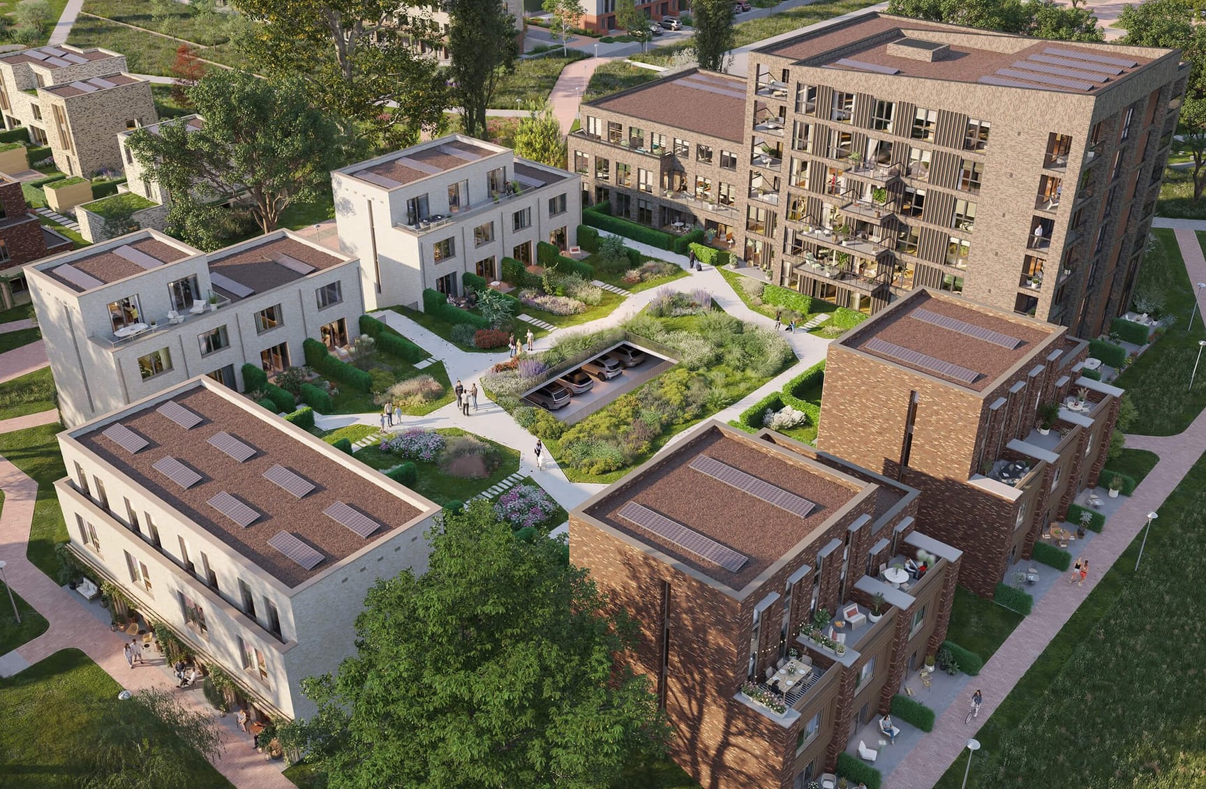 Elke woning heeft een eigen terras of patio met veel privacy. Kinderen spelen veilig op het autovrije dek en bewoners ontmoeten elkaar in het groen. De woonoppervlakte varieert van circa 124 tot 211 m².