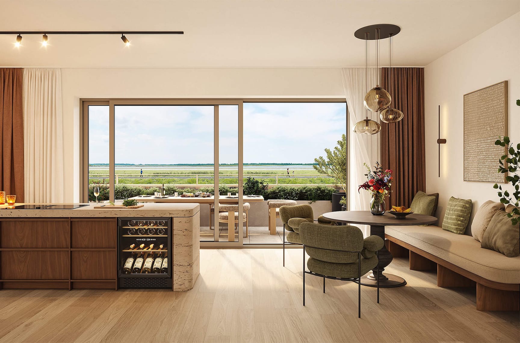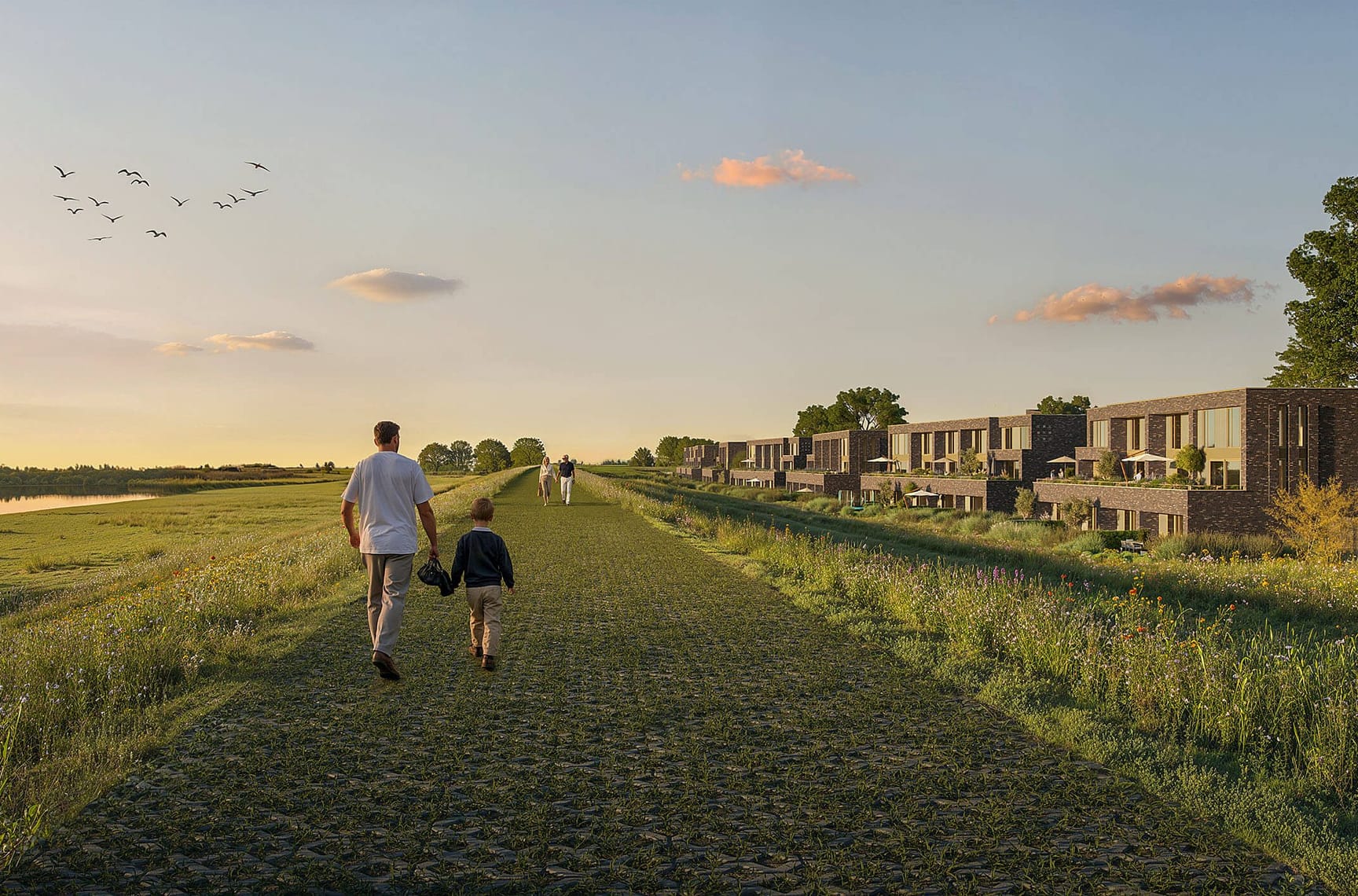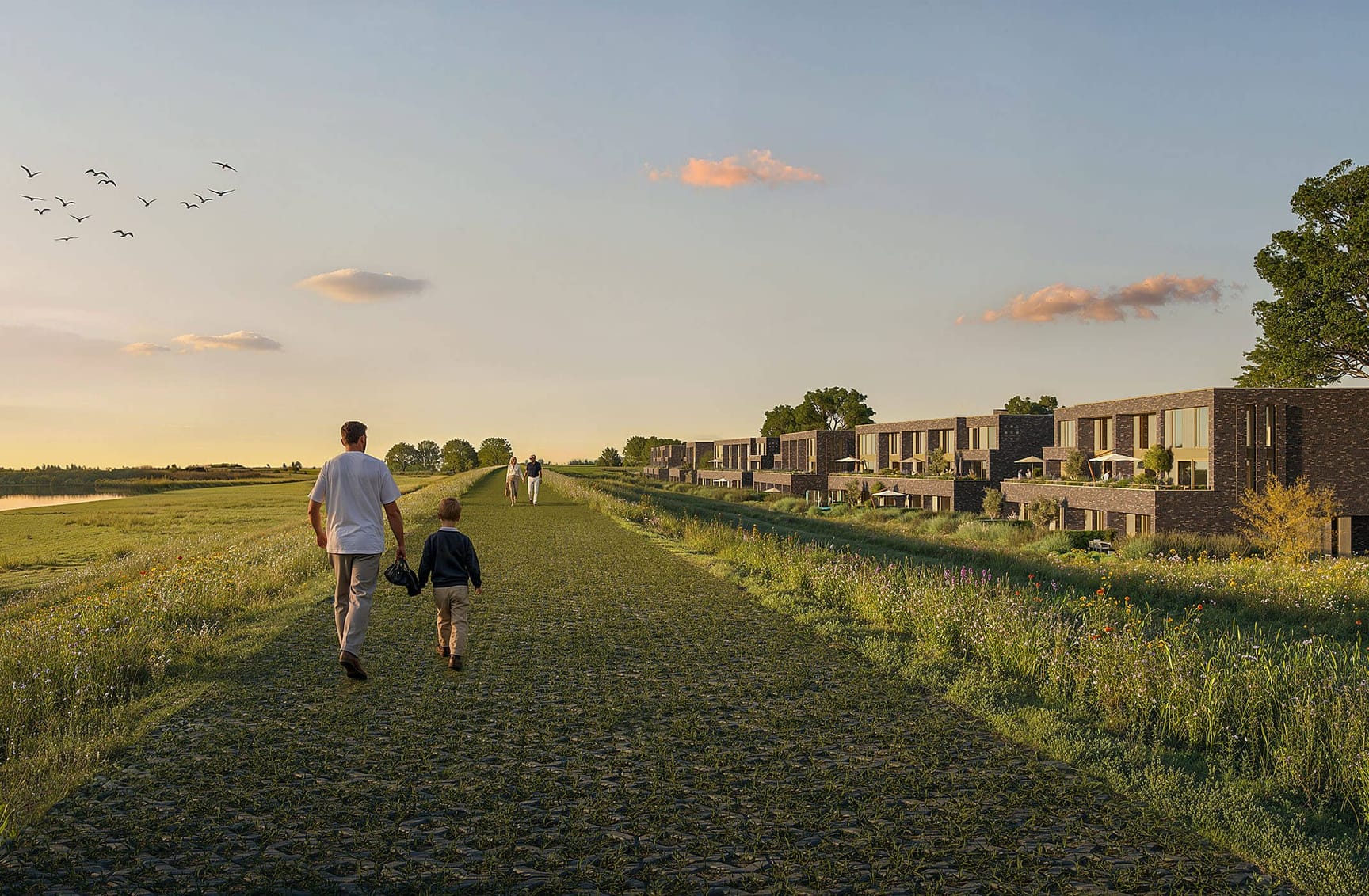 De woningen staan iets hoger, waardoor je vanuit de woonkamer over het water kijkt. Beneden ligt de tuin, boven een terras of balkon op het zuiden of westen. Ruimte, licht en uitzicht staan centraal. Hier woon je letterlijk op de grens van stad en natuur.