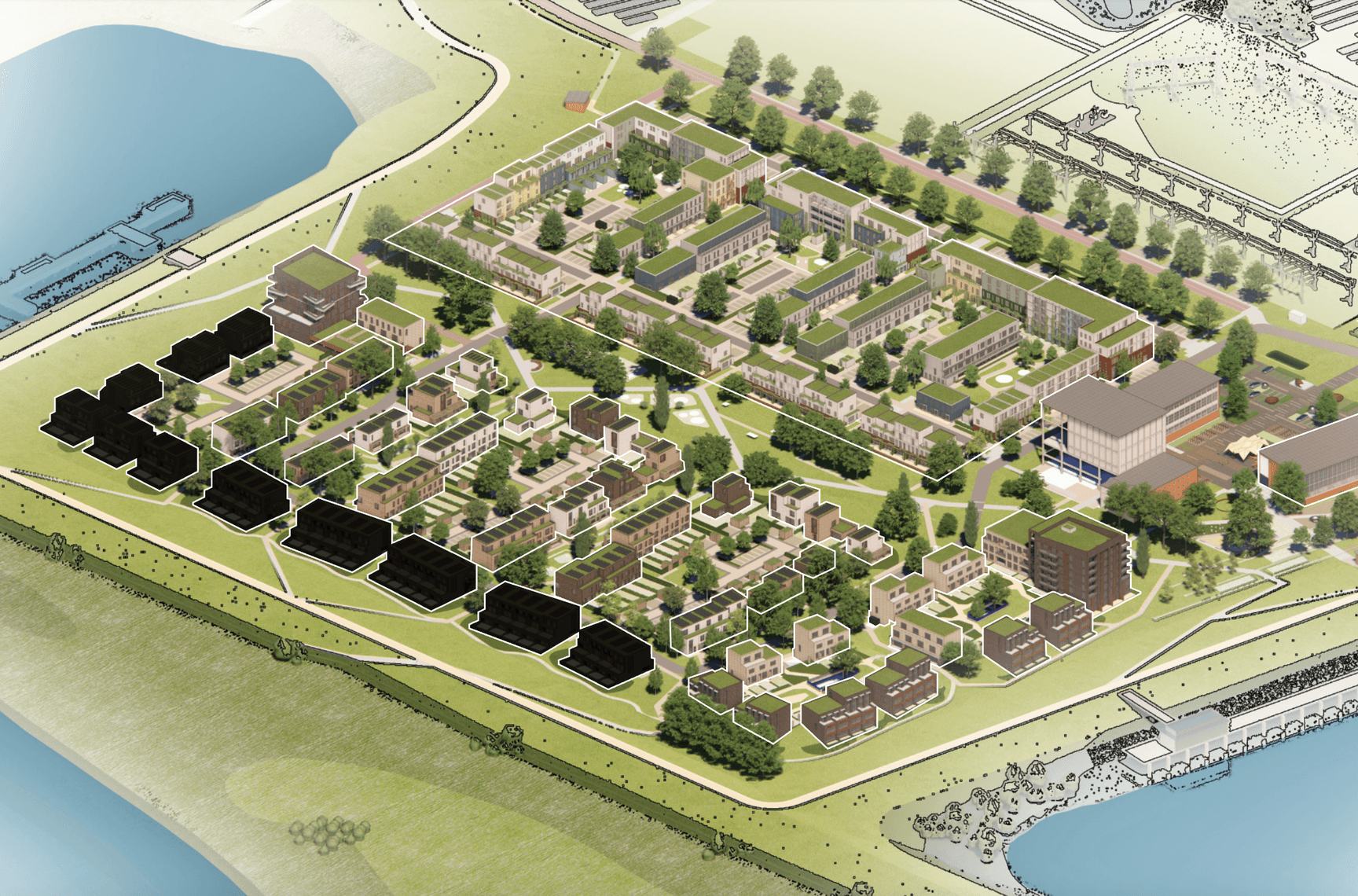 De dijkwoningen liggen op een bijzondere plek in Nieuw Harculo: direct aan de IJssel of met uitzicht op de haven. Ze vormen de overgang tussen het rivierenlandschap en de wijk. Stoere woningen met een eigen karakter, geïnspireerd op het industriële verleden van de plek.