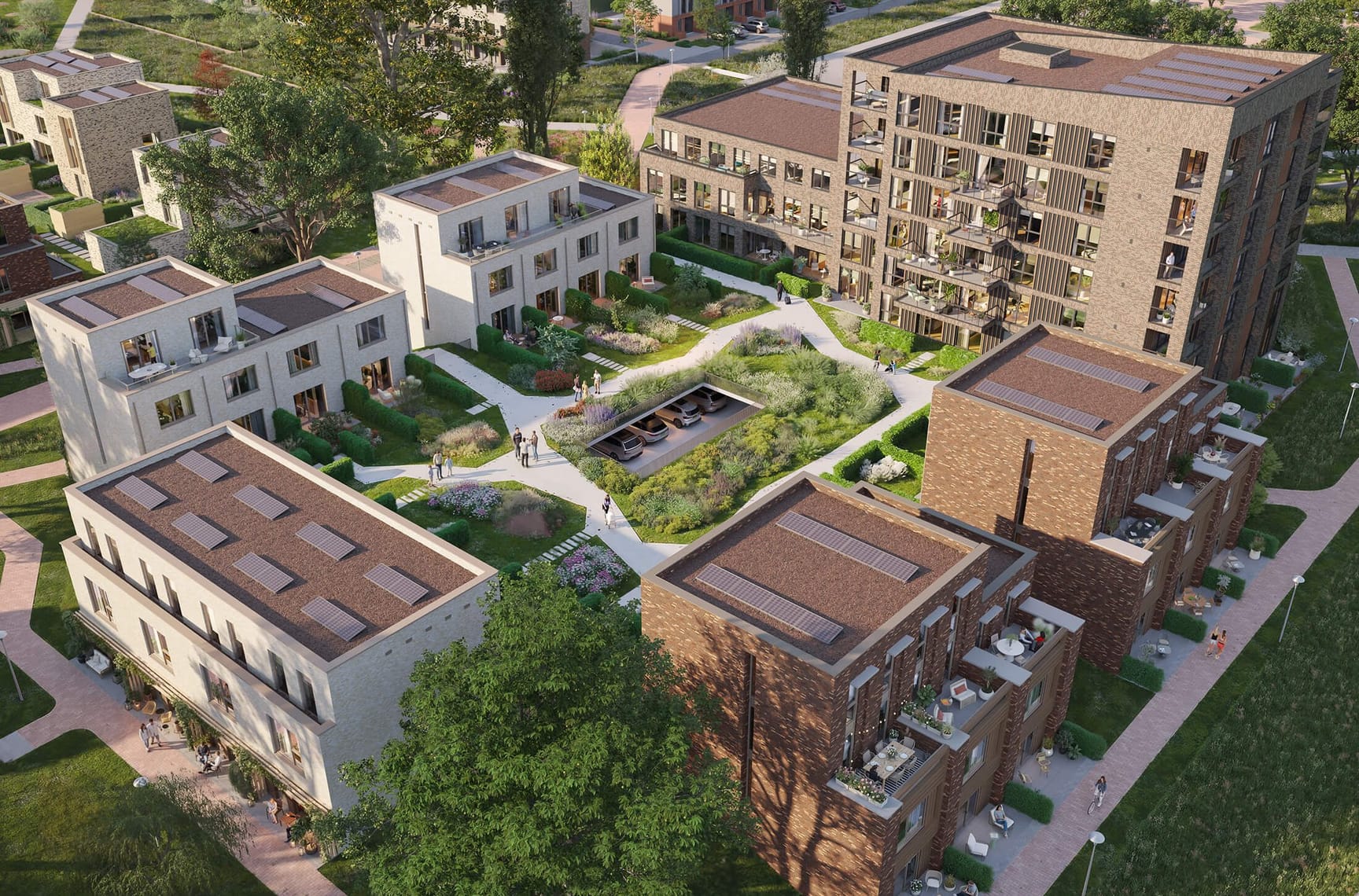 Elke woning heeft een eigen terras of patio met veel privacy. Kinderen spelen veilig op het autovrije dek en bewoners ontmoeten elkaar in het groen. De woonoppervlakte varieert van circa 124 tot 211 m².